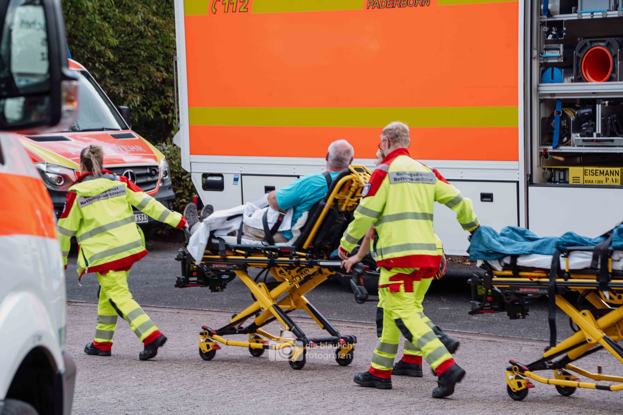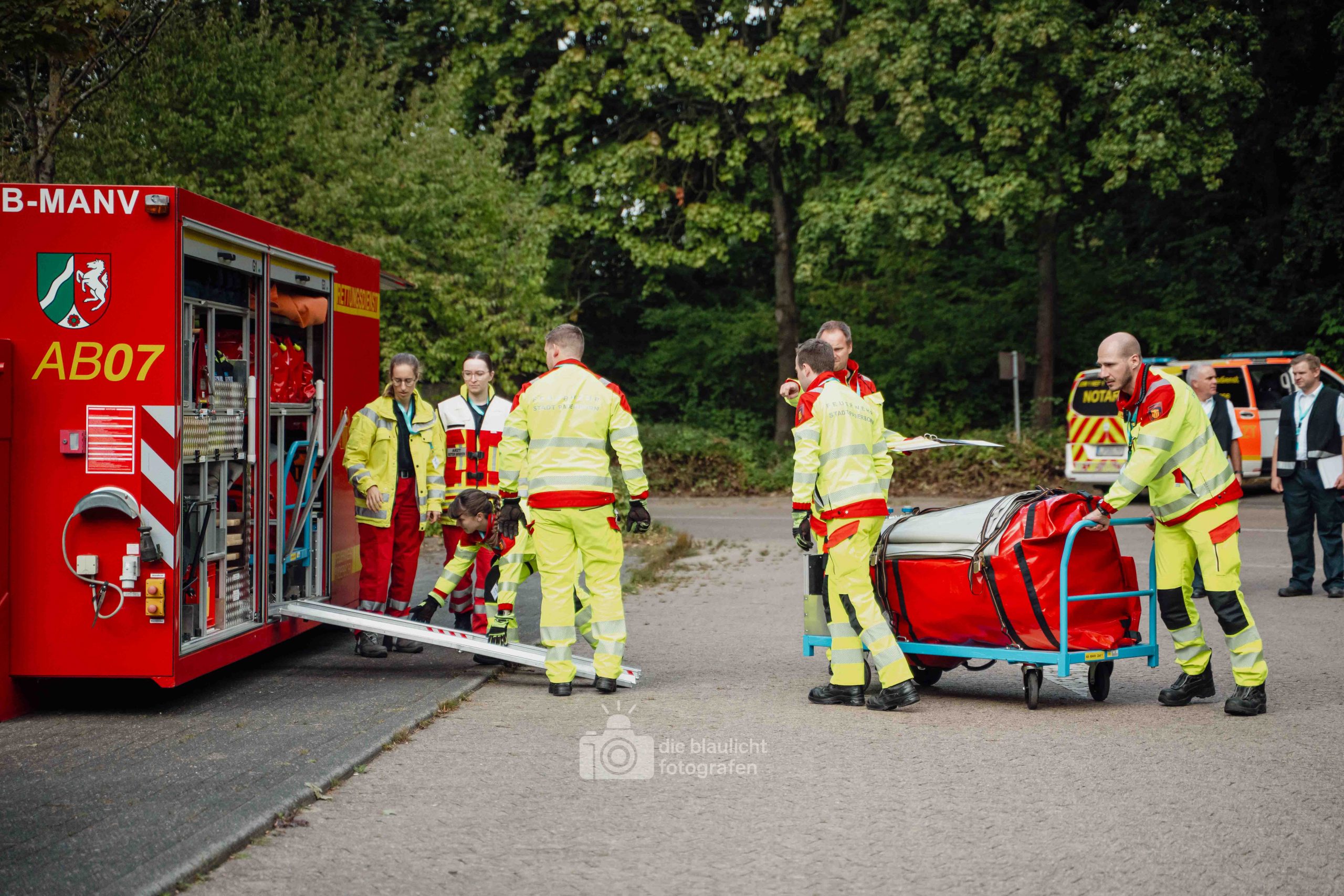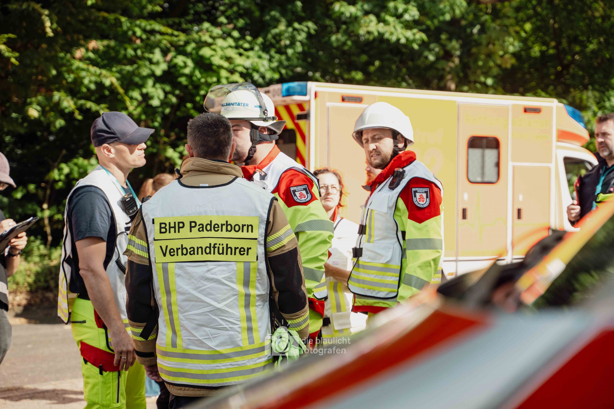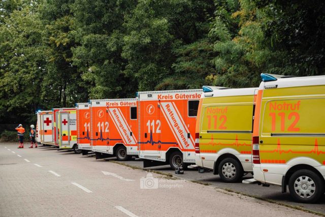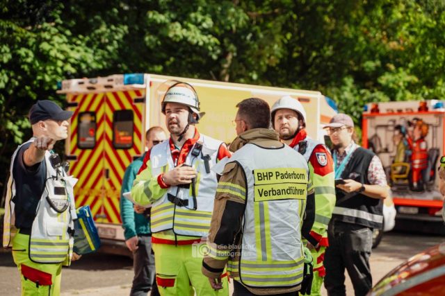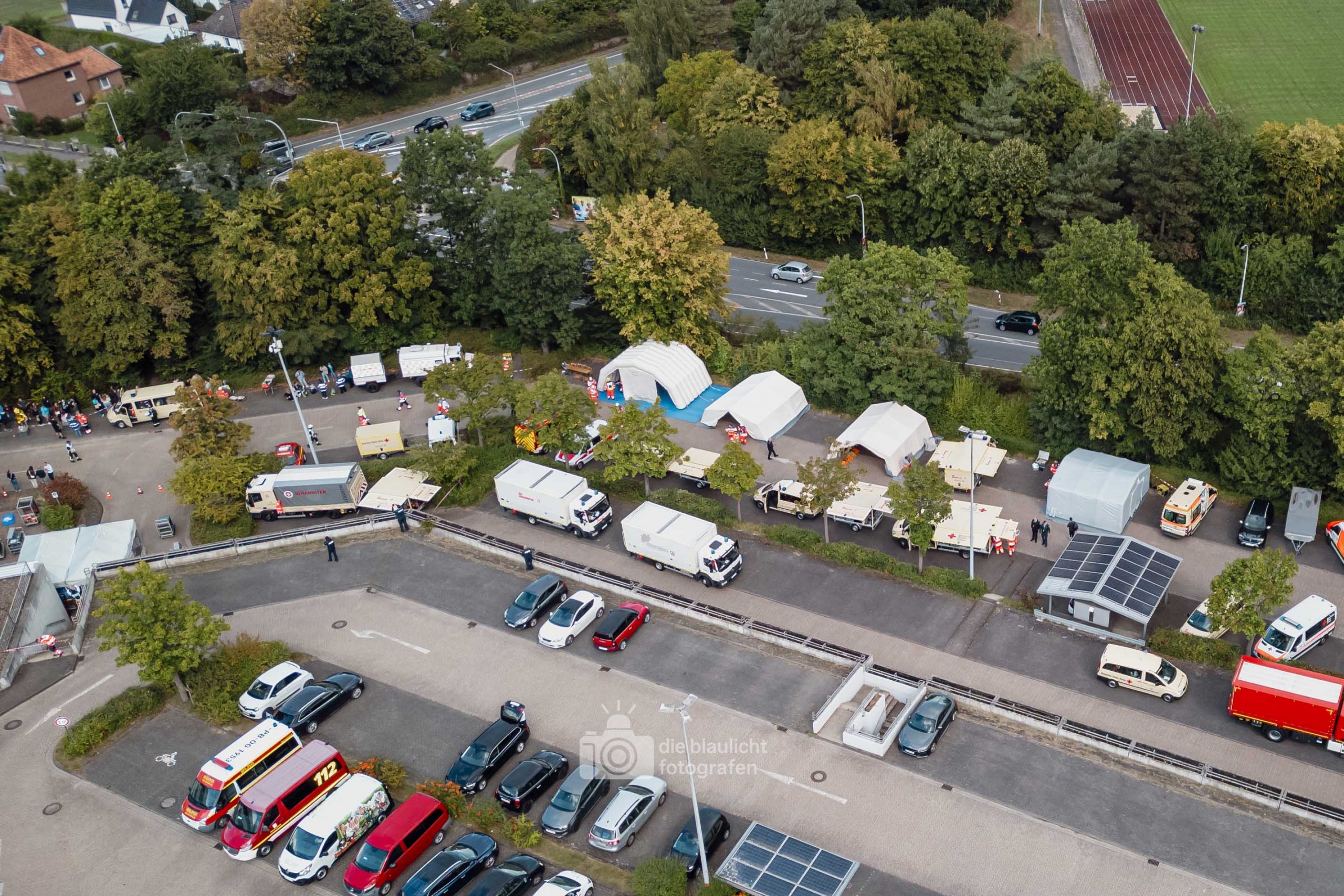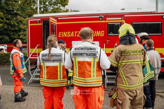 Nach und nach wurden weitere Einheiten alarmiert, darunter die Bereitschaften aus Paderborn und Bielefeld, die mit ihren Spezialmodulen – dem Behandlungsplatz 50 und dem Betreuungsplatz 500 – die Einsatzstelle ergänzten. Hierbei handelt es sich um Landeskonzepte des Katastophenschutzes NRW, die für die Behandlung und Versorgungen einer großen Anzahl von Verletzten und betroffen vorgesehen sind. Nach den Konzepten des Landes Nordrhein-Westfalen werde solche Konzepte überregional entsandt. So wuchs das Geschehen binnen kurzer Zeit von einer überschaubaren Rettungslage zu einem groß angelegten Katastropheneinsatz mit hunderten Beteiligten.