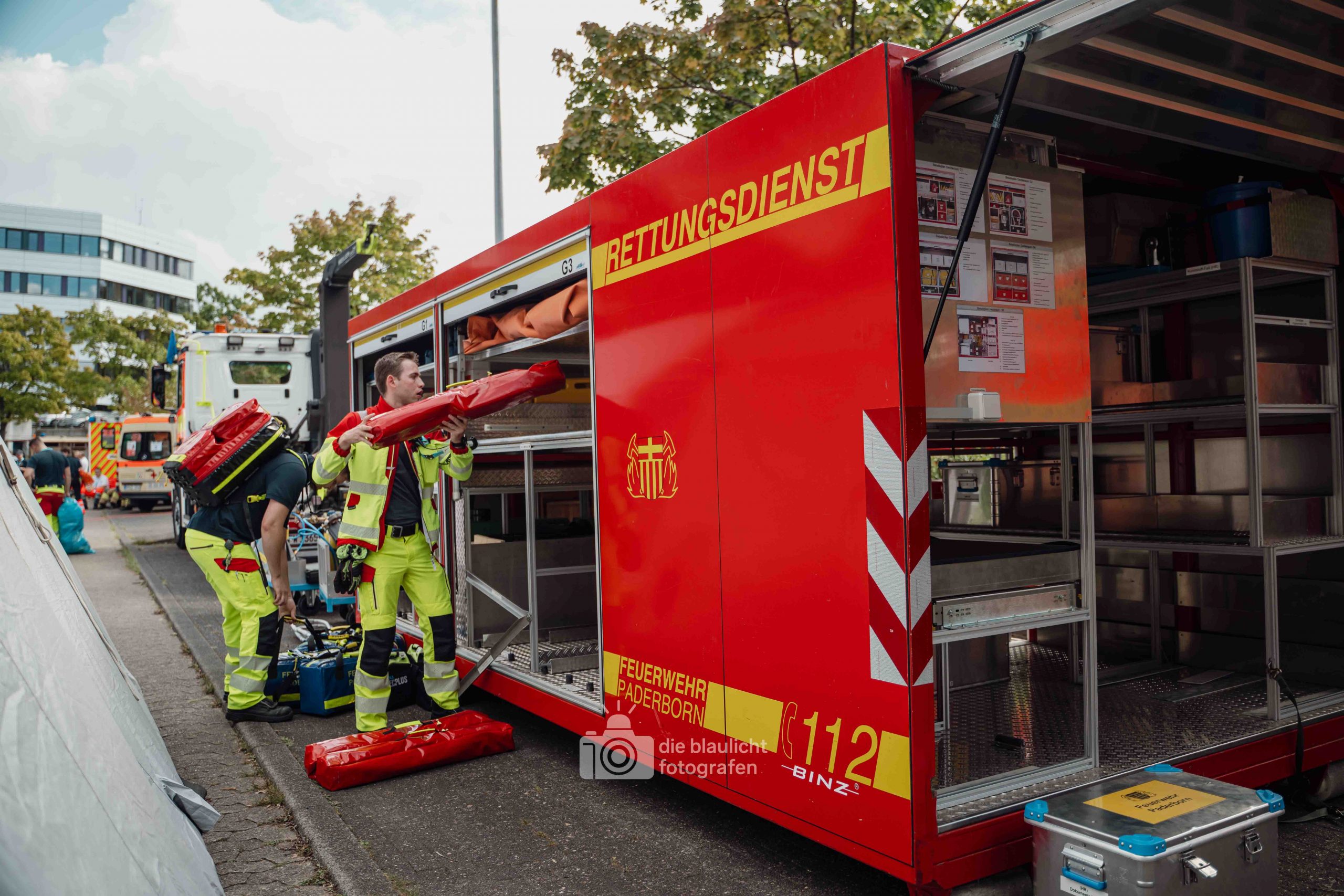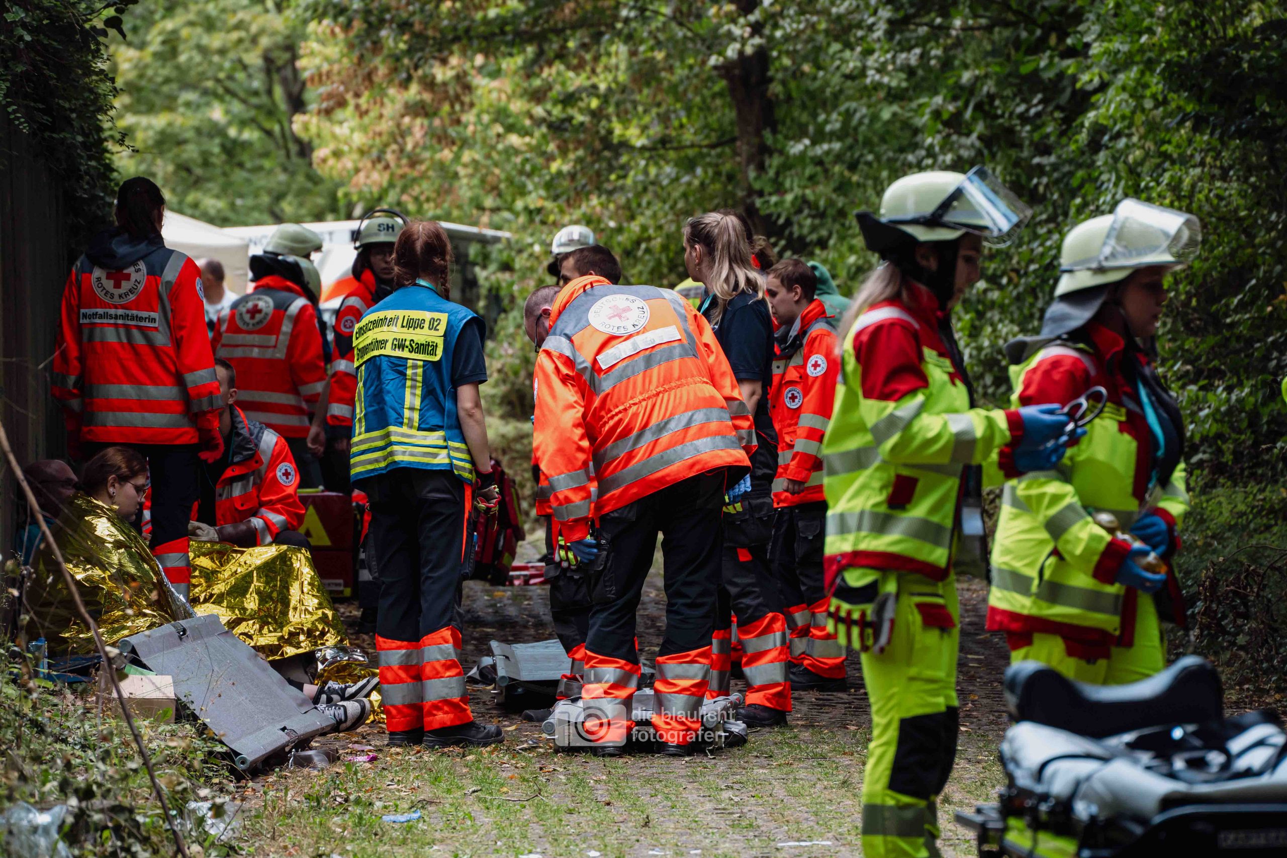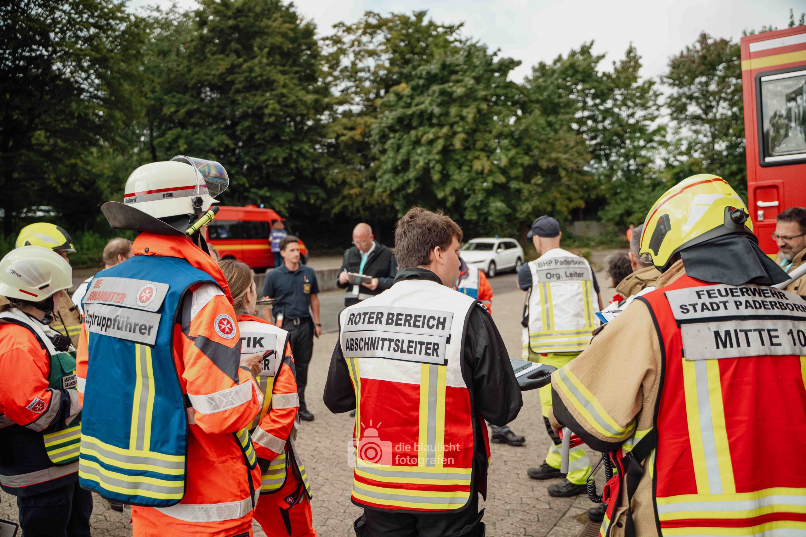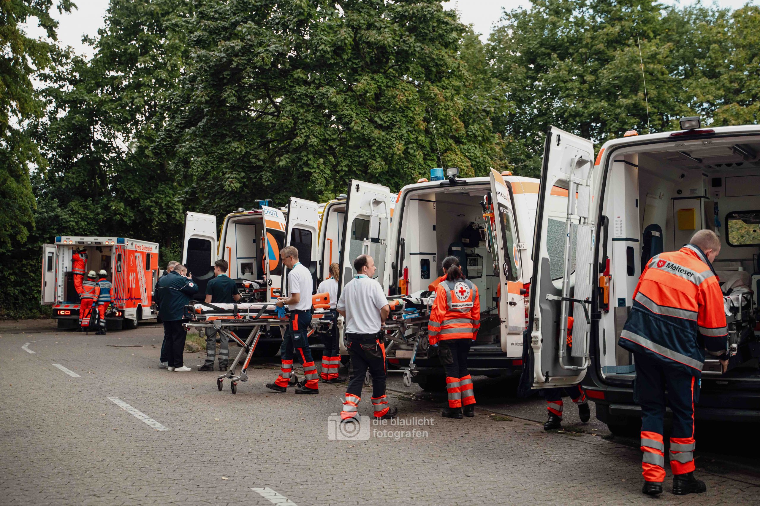 Nach und nach wurden weitere Einheiten alarmiert, darunter die Bereitschaften aus Paderborn und Bielefeld, die mit ihren Spezialmodulen – dem Behandlungsplatz 50 und dem Betreuungsplatz 500 – die Einsatzstelle ergänzten. Hierbei handelt es sich um Landeskonzepte des Katastophenschutzes NRW, die für die Behandlung und Versorgungen einer großen Anzahl von Verletzten und betroffen vorgesehen sind. Nach den Konzepten des Landes Nordrhein-Westfalen werde solche Konzepte überregional entsandt. So wuchs das Geschehen binnen kurzer Zeit von einer überschaubaren Rettungslage zu einem groß angelegten Katastropheneinsatz mit hunderten Beteiligten.