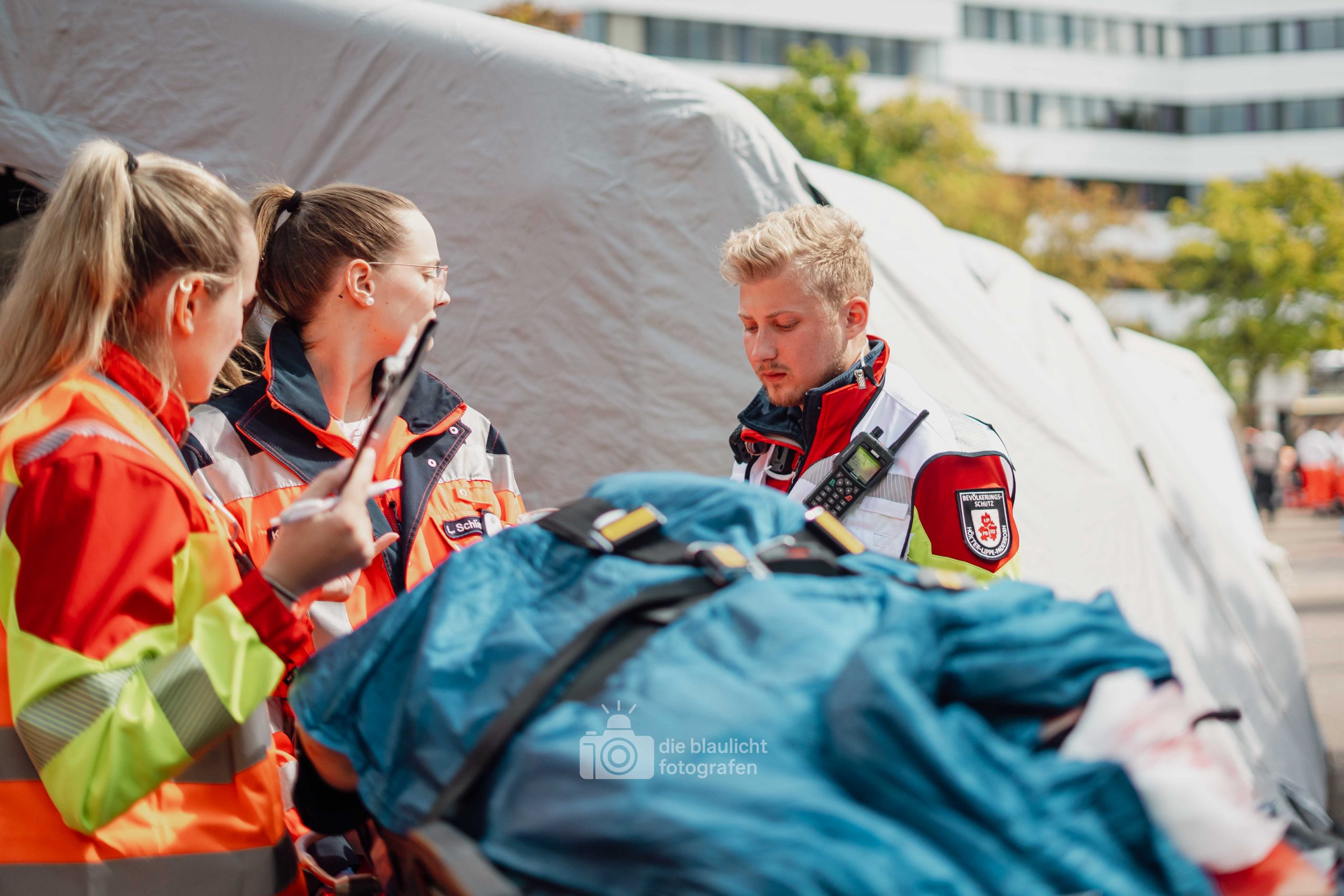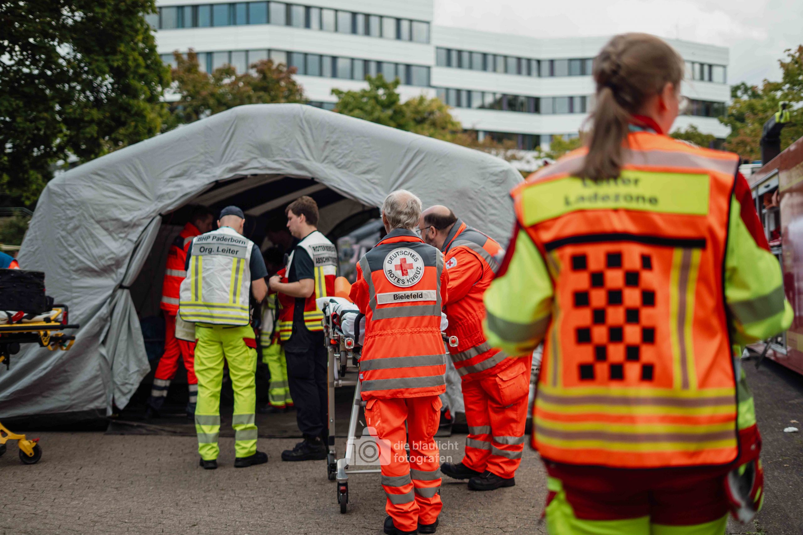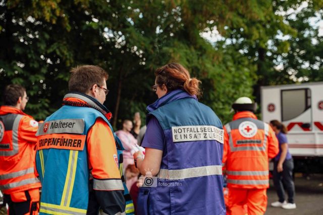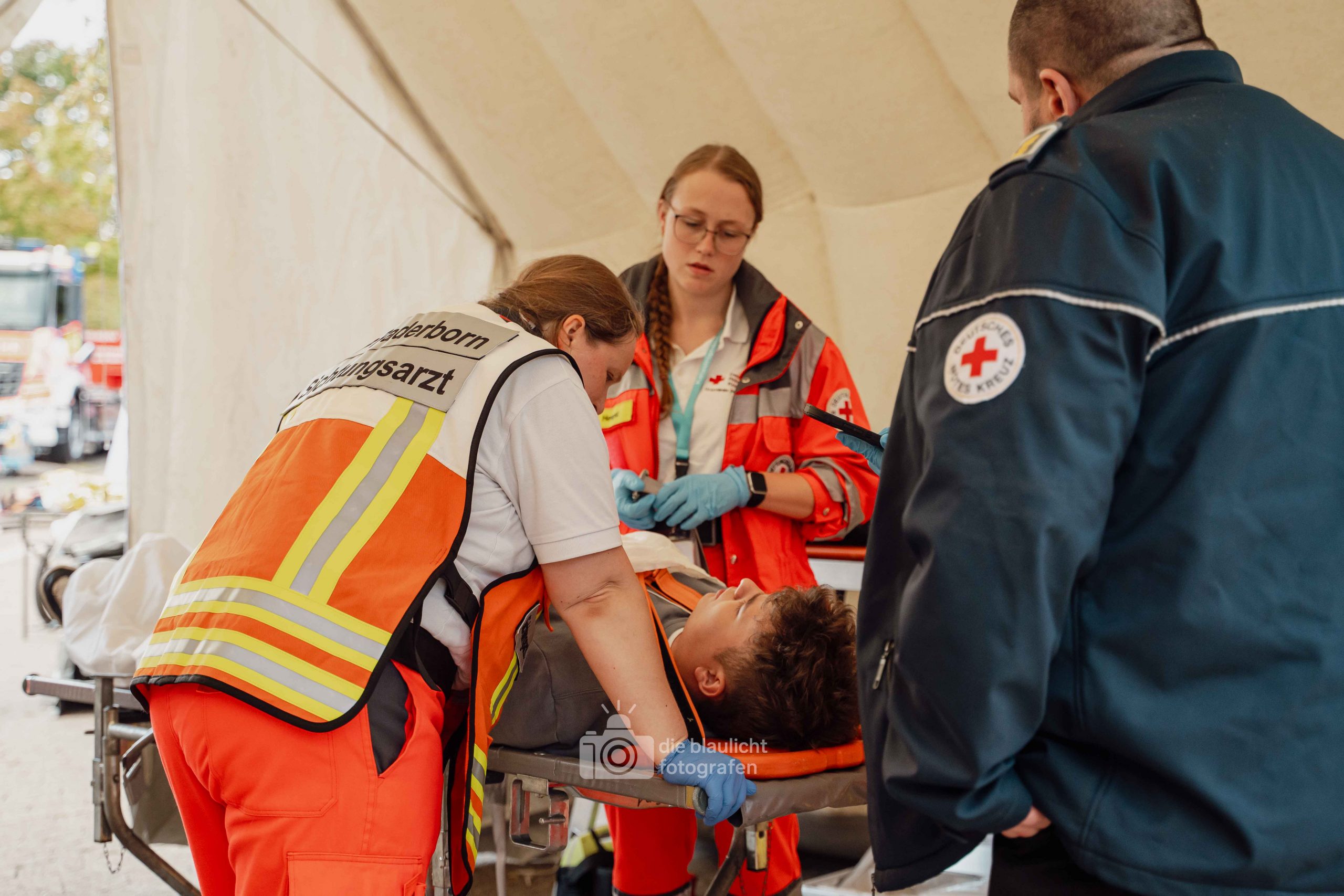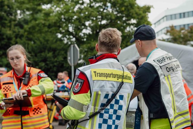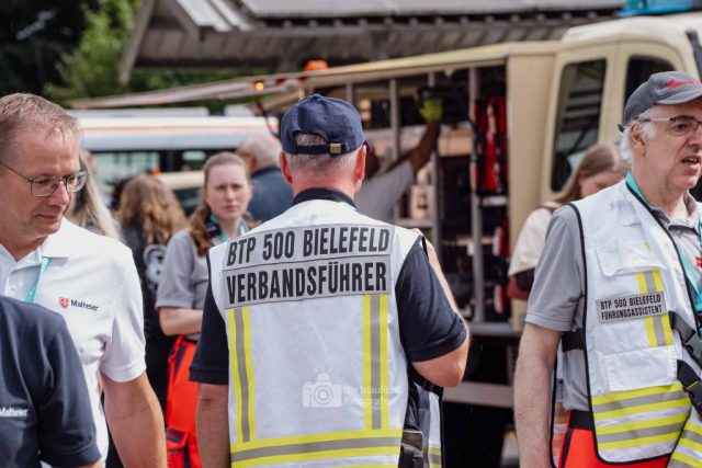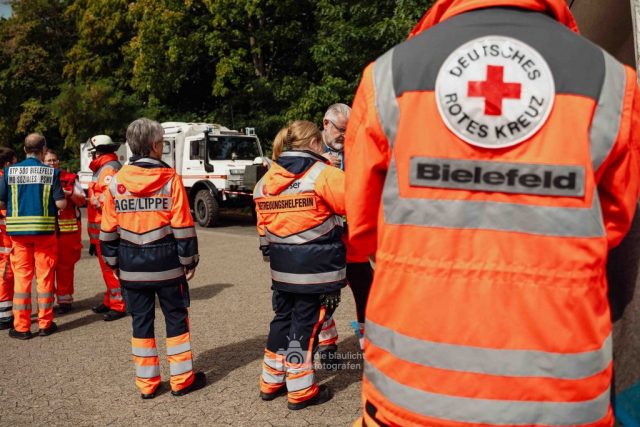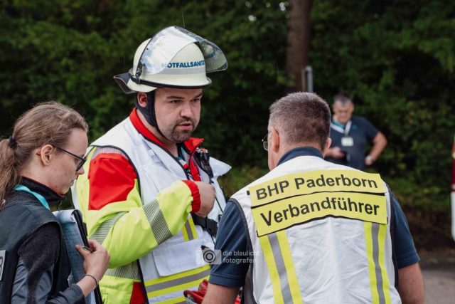 Auf den Parkplätzen rund um das Kreishaus entstanden Behandlungszelte und Sichtungsbereiche. Die Behandlungsplatz-Bereitschaft 50 aus Paderborn übernahm die medizinische Versorgung, während die Betreuungsplatz-Bereitschaft 500 aus Bielefeld die unverletzten Betroffenen registrierte, betreute und versorgte. Unterstützt wurden sie dabei von der Betreuungsstaffel des Malteser-Hilfsdienstes und einem Team für Psychosoziale Notfallversorgung (PSNV) aus dem Kreis Lippe. Schritt für Schritt wurde das Szenario nach Plan abgearbeitet – modular, koordiniert und praxisnah.