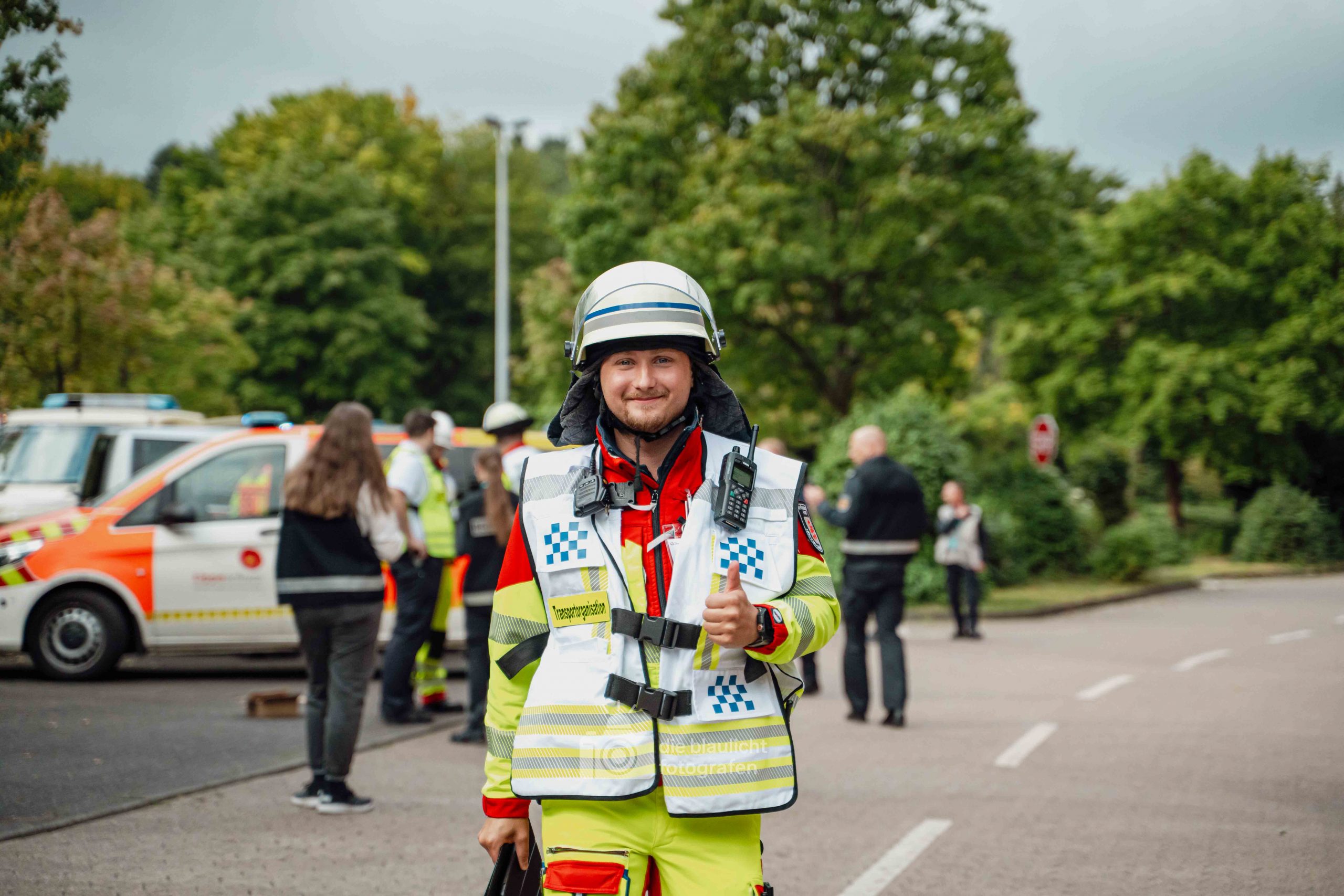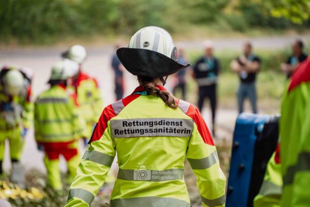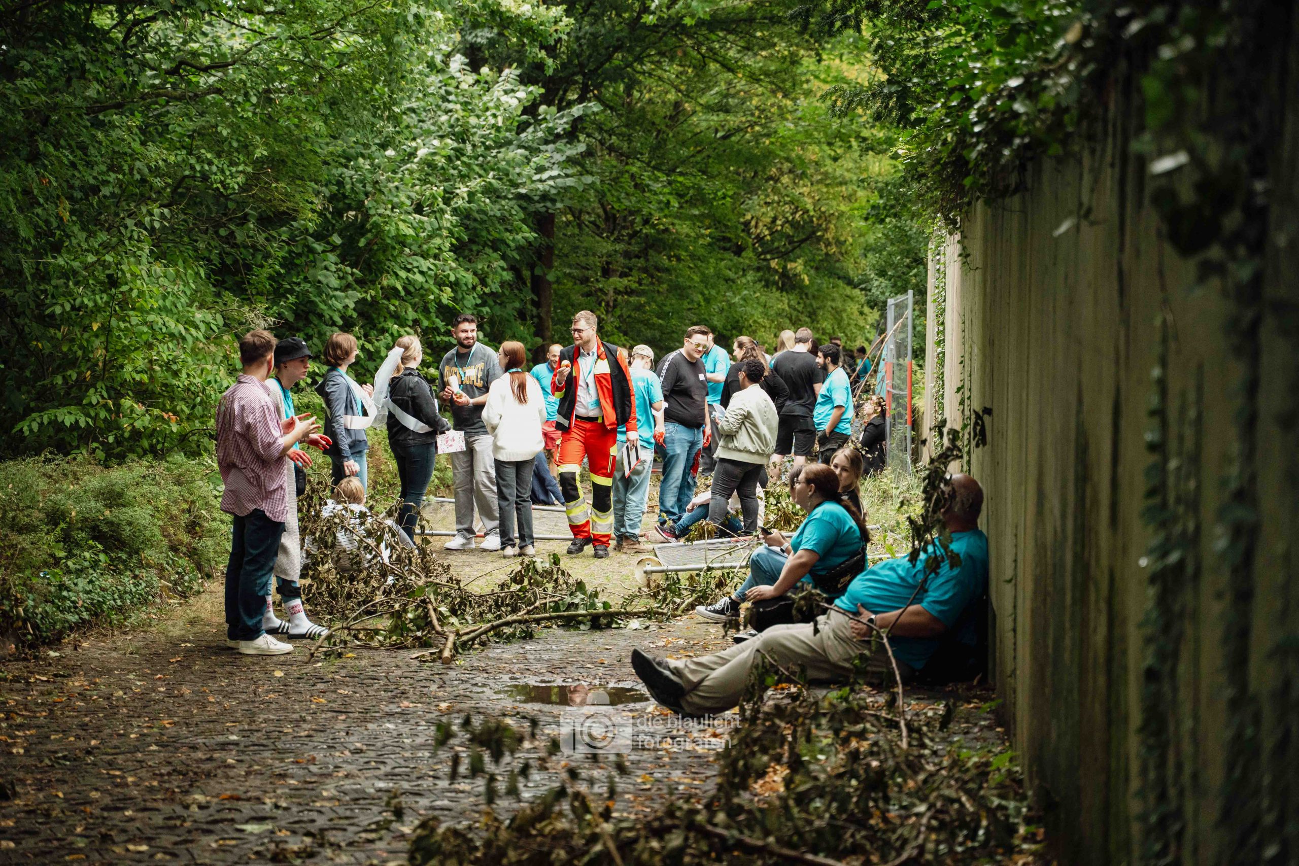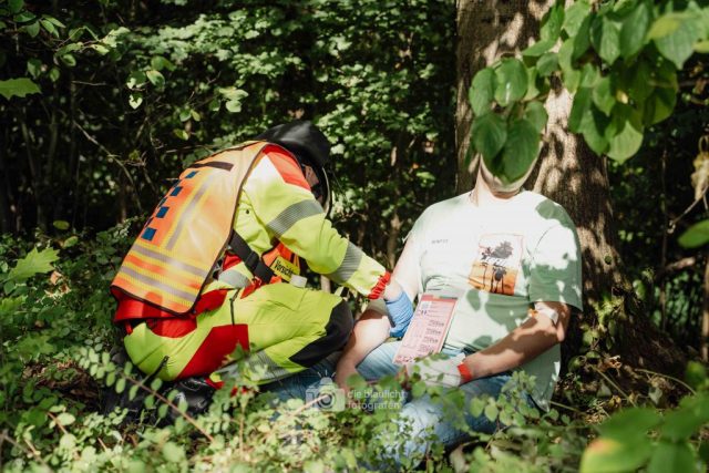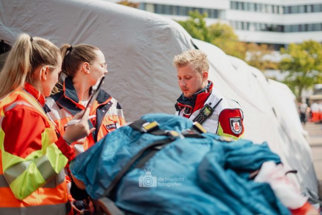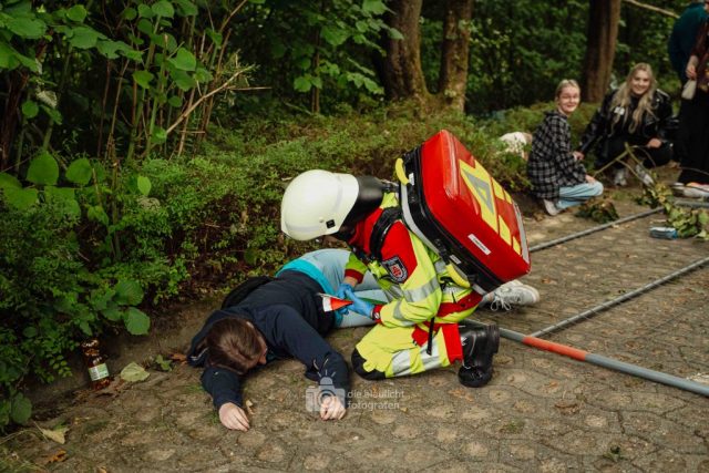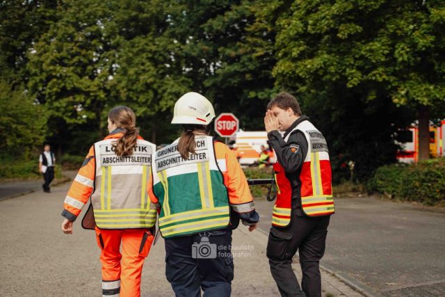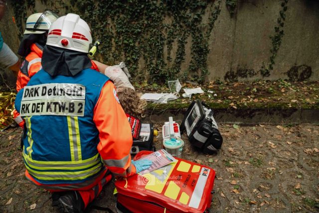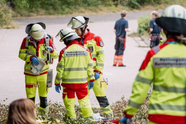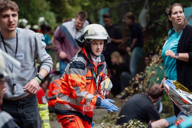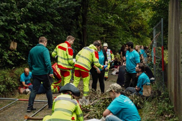 Schon am Morgen sammelten sich die ersten Kräfte im Bereitstellungsraum am Wortmann-Parkplatz. Um kurz nach 10 Uhr lief das Szenario schließlich an: Zeitgleich trafen das erste Notarzteinsatzfahrzeug und zwei Rettungswagen ein – die Rettungswagen sind alle besetzt mit angehenden Notfallsanitätern, die damit an vorderster Front standen. Für die jungen Azubis war es eine enorme Erfahrung. Gleich zu Beginn bot sich ihnen ein Bild der Verwüstung: Der Schadensbereich war eine etwa 150 Meter lange und nur vier Meter breite Gasse. Dort lagen die zahlreichen Verletzten, teilweise unter Bauzäunen oder Ästen, andere liefen orientierungslos und geschockt umher. Viele schrien um Hilfe, manche lagen still und bewusstlos am Boden. Für einige kam die Hilfe bereits bei den ersteintreffenden Kräften zu spät – eine eindringliche Erfahrung, die den Ernst einer solchen Lage verdeutlichte.