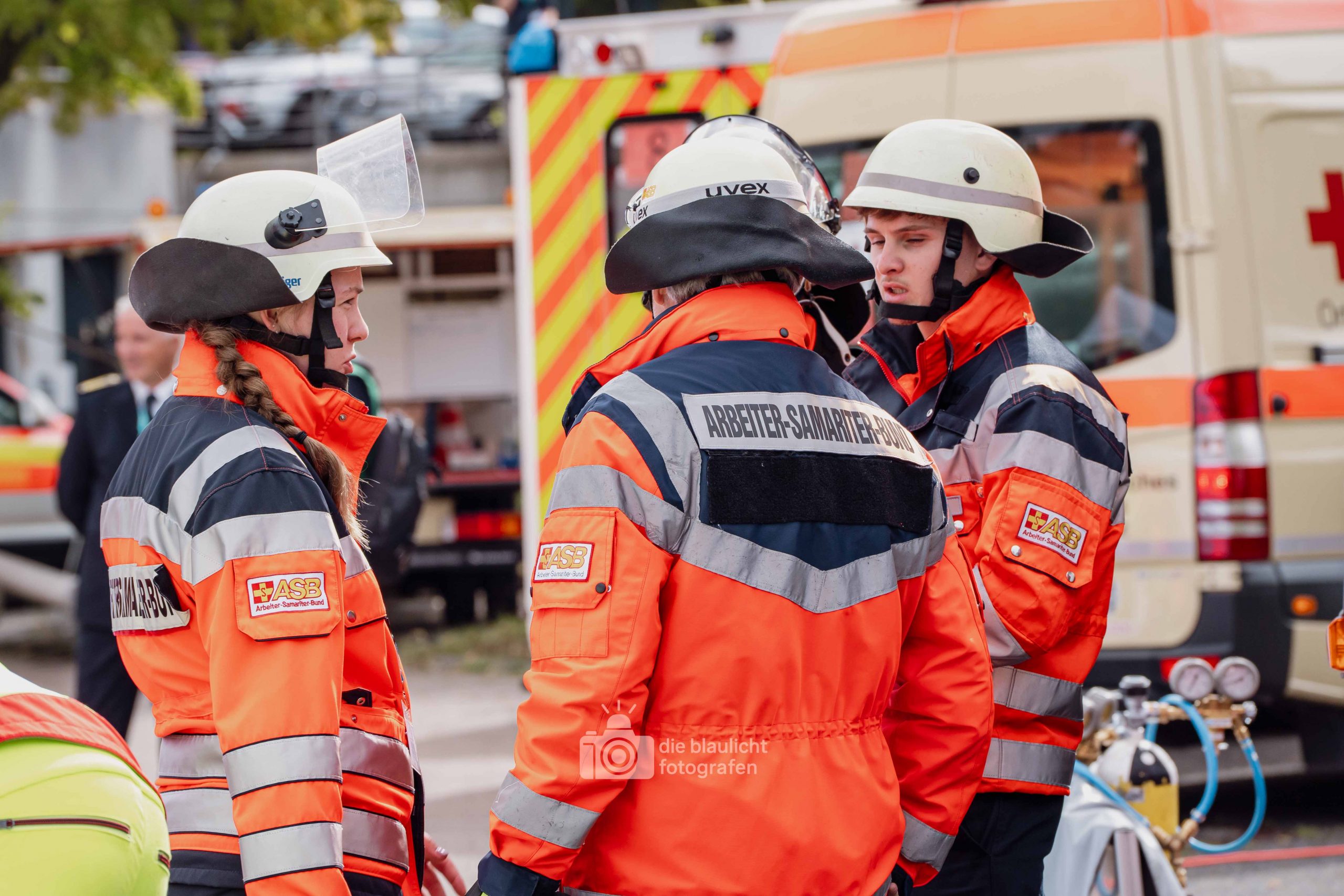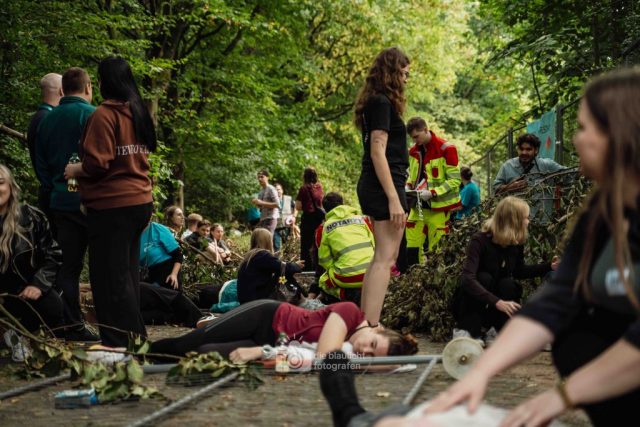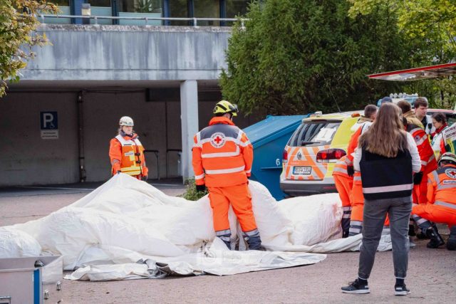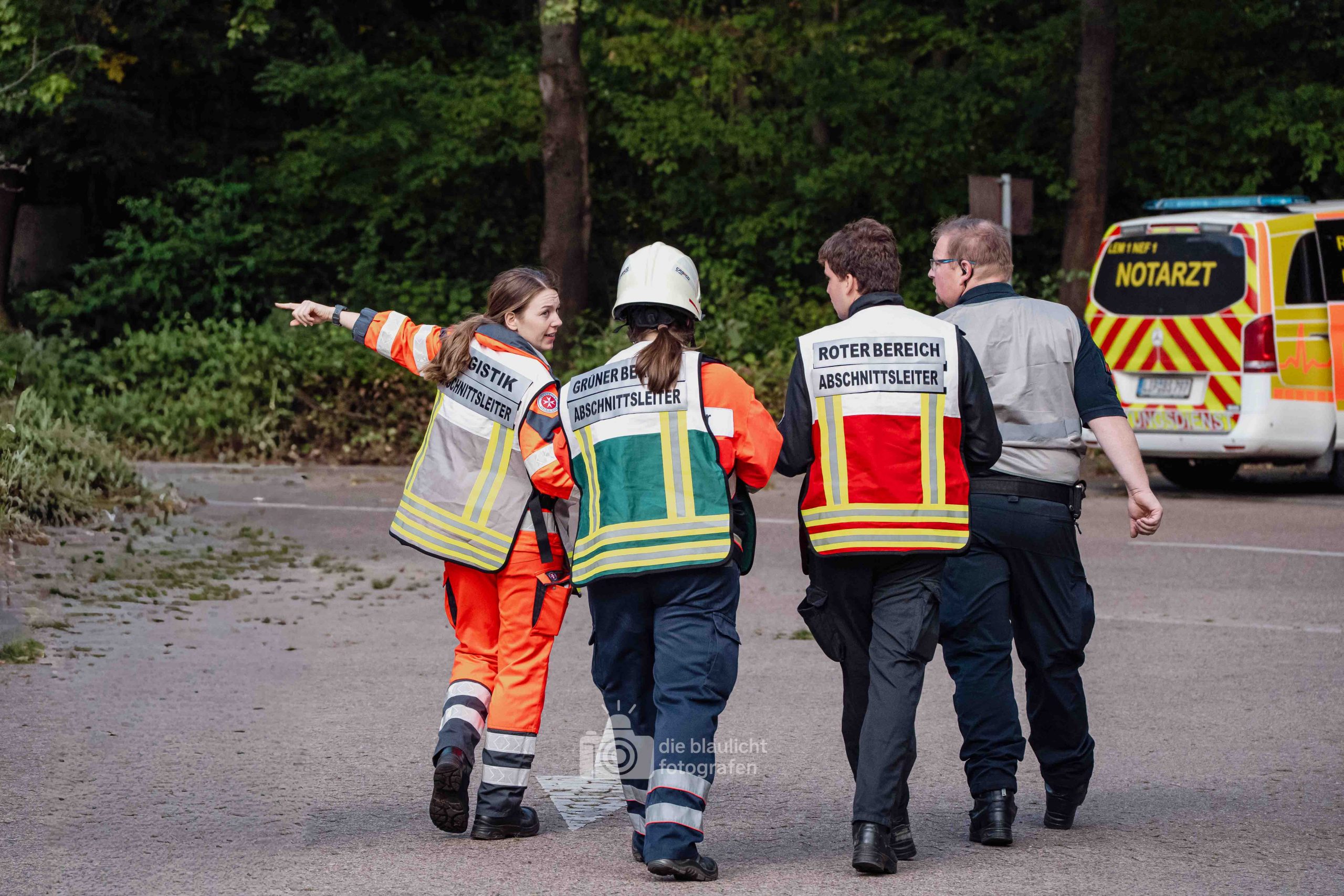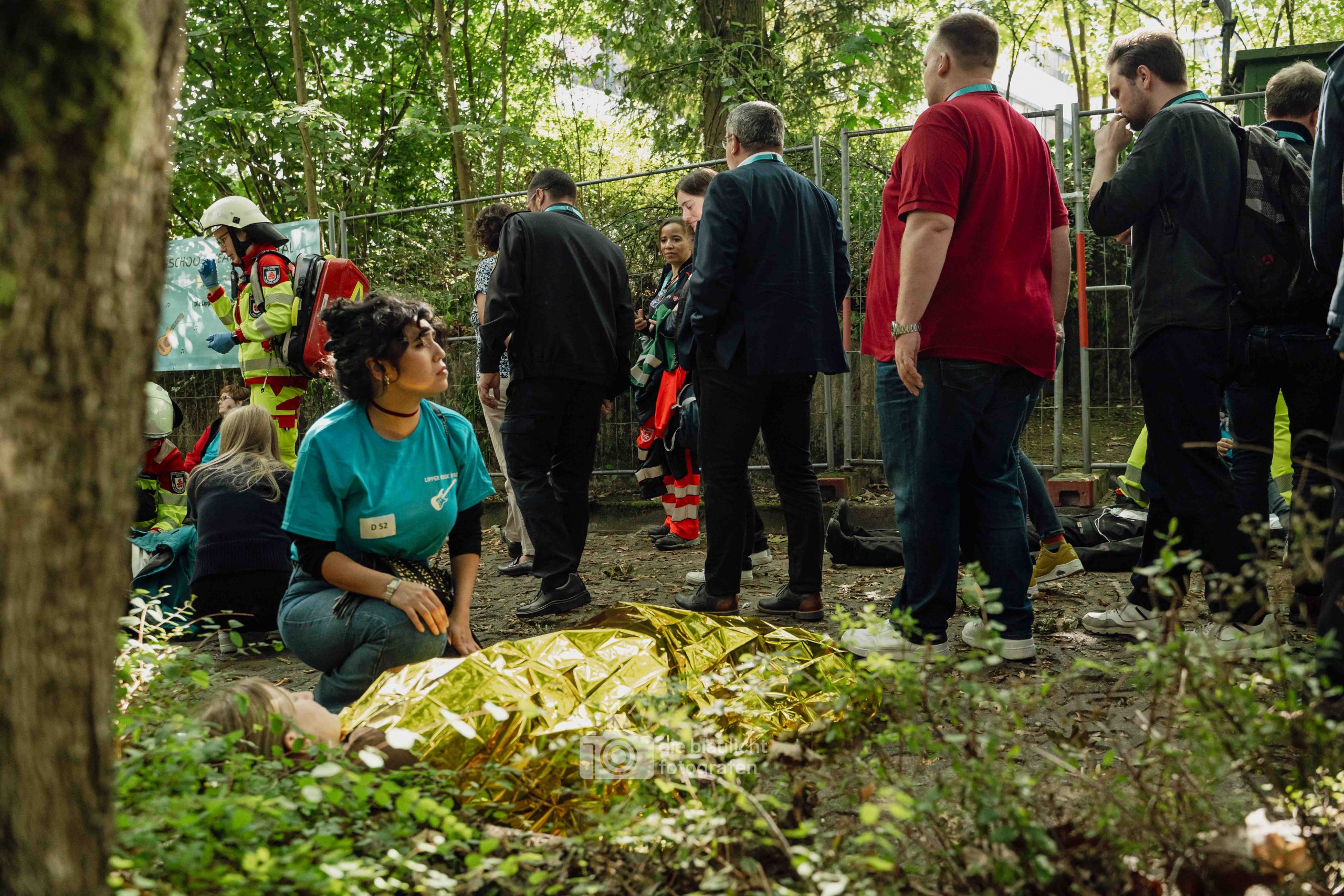 Schon am Morgen sammelten sich die ersten Kräfte im Bereitstellungsraum am Wortmann-Parkplatz. Um kurz nach 10 Uhr lief das Szenario schließlich an: Zeitgleich trafen das erste Notarzteinsatzfahrzeug und zwei Rettungswagen ein – die Rettungswagen sind alle besetzt mit angehenden Notfallsanitätern, die damit an vorderster Front standen. Für die jungen Azubis war es eine enorme Erfahrung. Gleich zu Beginn bot sich ihnen ein Bild der Verwüstung: Der Schadensbereich war eine etwa 150 Meter lange und nur vier Meter breite Gasse. Dort lagen die zahlreichen Verletzten, teilweise unter Bauzäunen oder Ästen, andere liefen orientierungslos und geschockt umher. Viele schrien um Hilfe, manche lagen still und bewusstlos am Boden. Für einige kam die Hilfe bereits bei den ersteintreffenden Kräften zu spät – eine eindringliche Erfahrung, die den Ernst einer solchen Lage verdeutlichte.